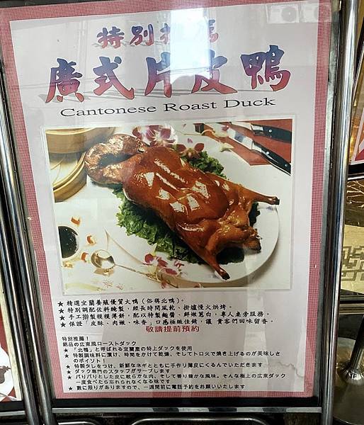 門口招牌上,特別推薦「廣是片鴨』,這需要提前預約。定位時,我們就已經預約一隻烤鴨三吃,這點很重要;若當日來才加訂,可能會無功而返,吃不到這招牌菜。
