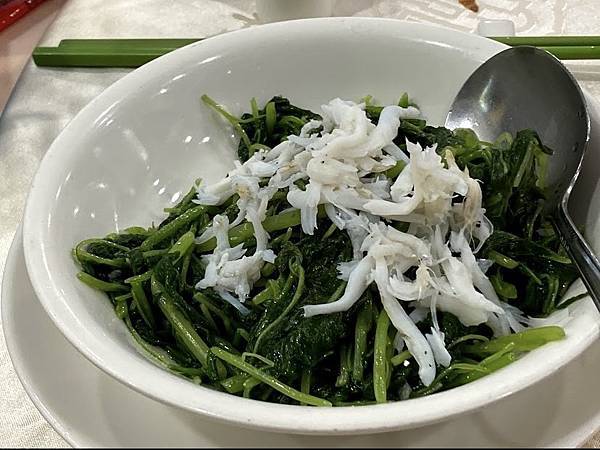 (3)小魚莧菜:菜上來時好美,綠油油的青菜,上頭布滿著白白的吻仔魚。小朋友看到吵著要吃魚,這道菜吃起來鮮嫩不咬口。蔬菜店家可能事先挑過,並沒有太多纖維口感,非常好入口,很推這道菜。